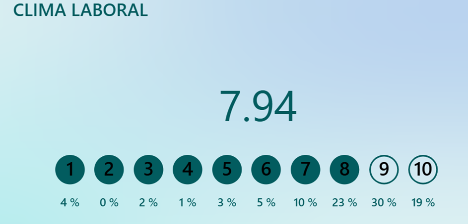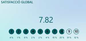 Respecte a la satisfacció global obté un resultat de 7.82 aquest any. Sent major de 7 la valoració que fan el 86.20 % (81 professionals que responen el qüestionari de 94). Ha disminuït lleugerament respecte a l’any anterior (del 92,6 % el 2024 al 86.20 % el 2025, una diferència de 6.4 punts percentuals), aquesta dada continua reflectint un alt nivell de satisfacció.