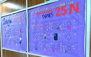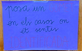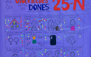 D’altra banda, el 25-N, el Dia Internacional per a l’Eliminació de les Violències contra les Dones, a l’oficina de Progrés vam realitzar una acció participativa: el Bingo de les Violències Masclistes. En aquesta acció hem descrit diferents tipus de violències masclistes quotidianes i cada persona que ha treballat o passat per l’oficina ha pogut deixar el seu gomet si ha viscut aquesta situació. Impacta especialment el fet que totes les violències han estat viscudes, en un grau o en un altre. En destaquem la predominança de persones que han patit bromes masclistes, que han estat assetjades a l’espai públic o que s’han sentit més respectades si anaven amb un home. Aquesta acció ha servit per conscienciar les violències masclistes quotidianes que ens poden passar més desapercebudes.