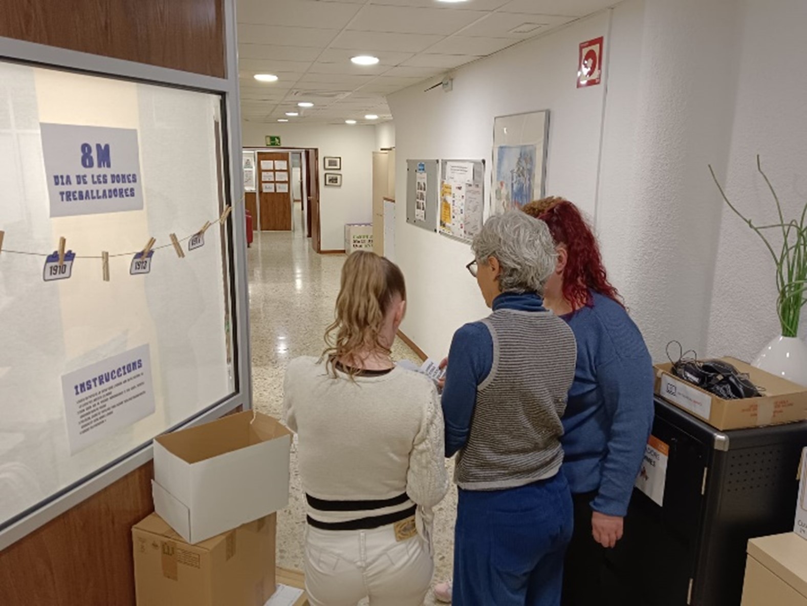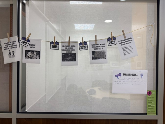 I amb l’arribada del mes de març, hem realitzat una sèrie d’activitats en el marc del 8M. Aquest dia, el Dia de les Dones Treballadores, a l’oficina vam proposar una dinàmica ben interessant: conèixer la cronologia de l’adquisició dels nostres drets. Vam poder ressaltar dates clau com l’adquisició del dret a vot de les dones el 1931 o l’establiment dels plans d’igualtat a les empreses el 2015. L’activitat s’ha muntat al llarg del passadís de la seu de Progrés, i tant treballadores com alumnat han pogut participar.